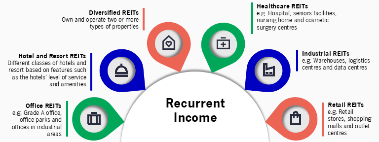 REITs aim to deliver a source of recurrent income to investors through focused investment in a portfolio of income-generating properties such as shopping malls, offices, hotels and service apartments.