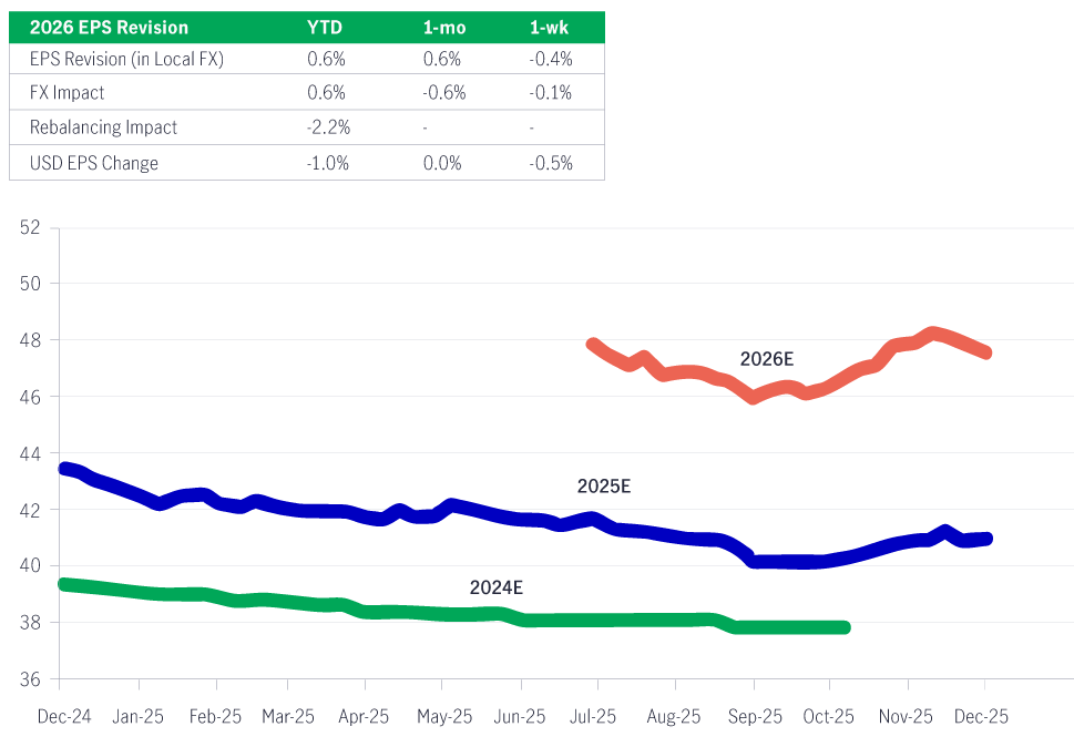 Asian earnings estimates for 2026 were revised down for most of the year, but we witnessed an inflexion point in the fourth quarter, driven by Korea, Taiwan, and Hong Kong on the back of strength in technology.