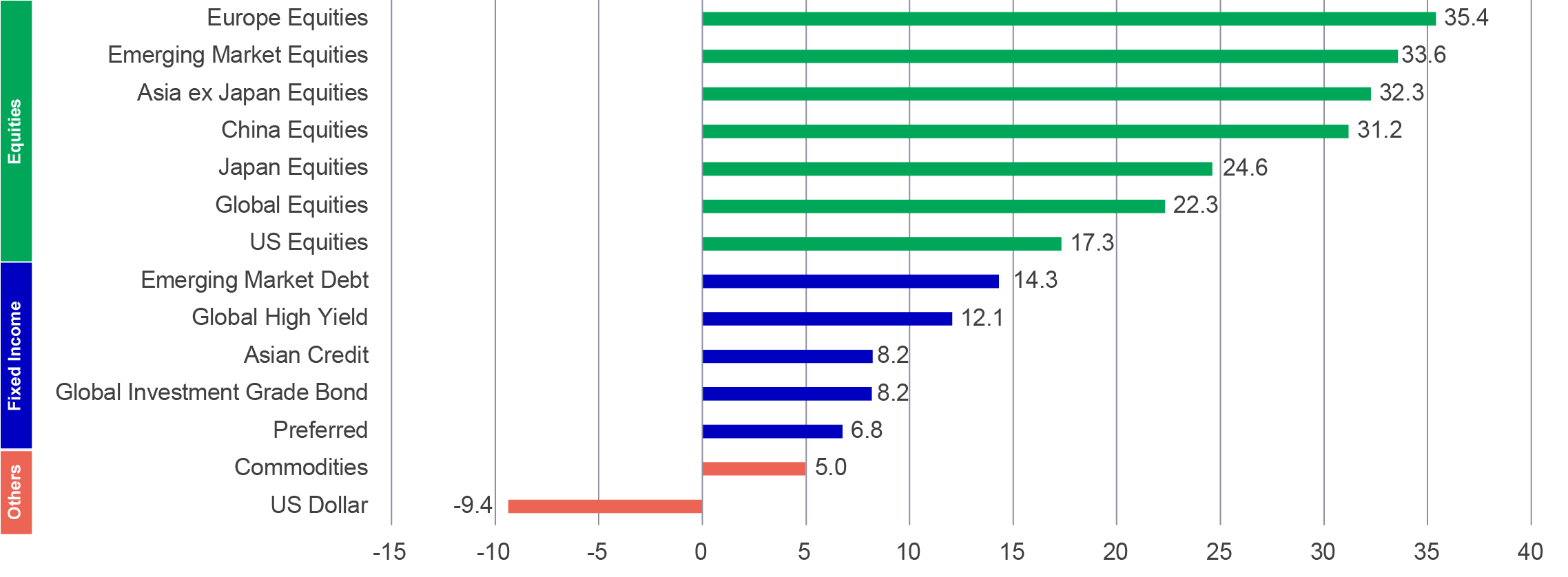 1 Source: Bloomberg, FactSet, data as of 31 December 2025. Performance is in USD and total return. Equities indices represented by MSCI indices. Preferred securities = ICE BofAML US All Cap Securities index; Emerging Market Debt = JPM EMBI. Asian Dollar Bond represented by Markit iboxx index. Global high yield bond = Bloomberg Global High Yield total return index unhedge. Global Investment grade bond represented by FTSE indices. Commodities = TR CRB Index. US dollar = US dollar index. Past performance is not indicative of future performance.
