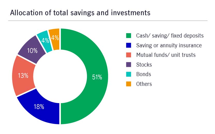 Cash, savings, and fixed deposits make up 51% of Malaysians’ total assets, with the rest spread over other investments such as insurance, stocks, mutual funds, bonds and others. This indicates a dire need for further asset diversification.